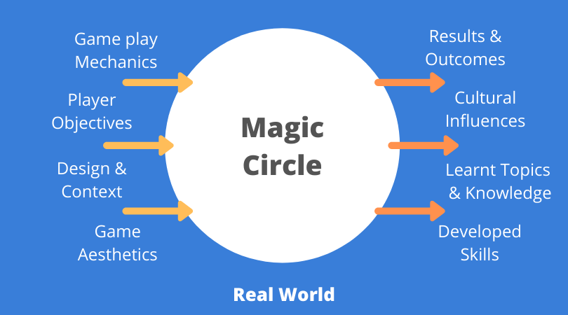A concept widely used in video games, the magic circle describes a place we visit in our psyches that has its own rules — it is also known as the ‘suspension of disbelief’. The magic circle outlines the fundamental boundaries of play, it defines the rules, mechanics, setting, objectives and player roles in any game, digital or real-world. Although the magic circle is an artificial construct: when a player enters and then leaves the magic circle they return to the real-world with newfound skills, knowledge, and motivations.