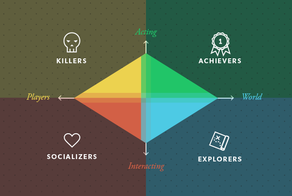 Bartle’s Taxonomy (aka Bartle Player Types) is based on character theory and player behaviour. The classification establishes player personality types based on behavioural patterns, their goals and motivations for playing a game.