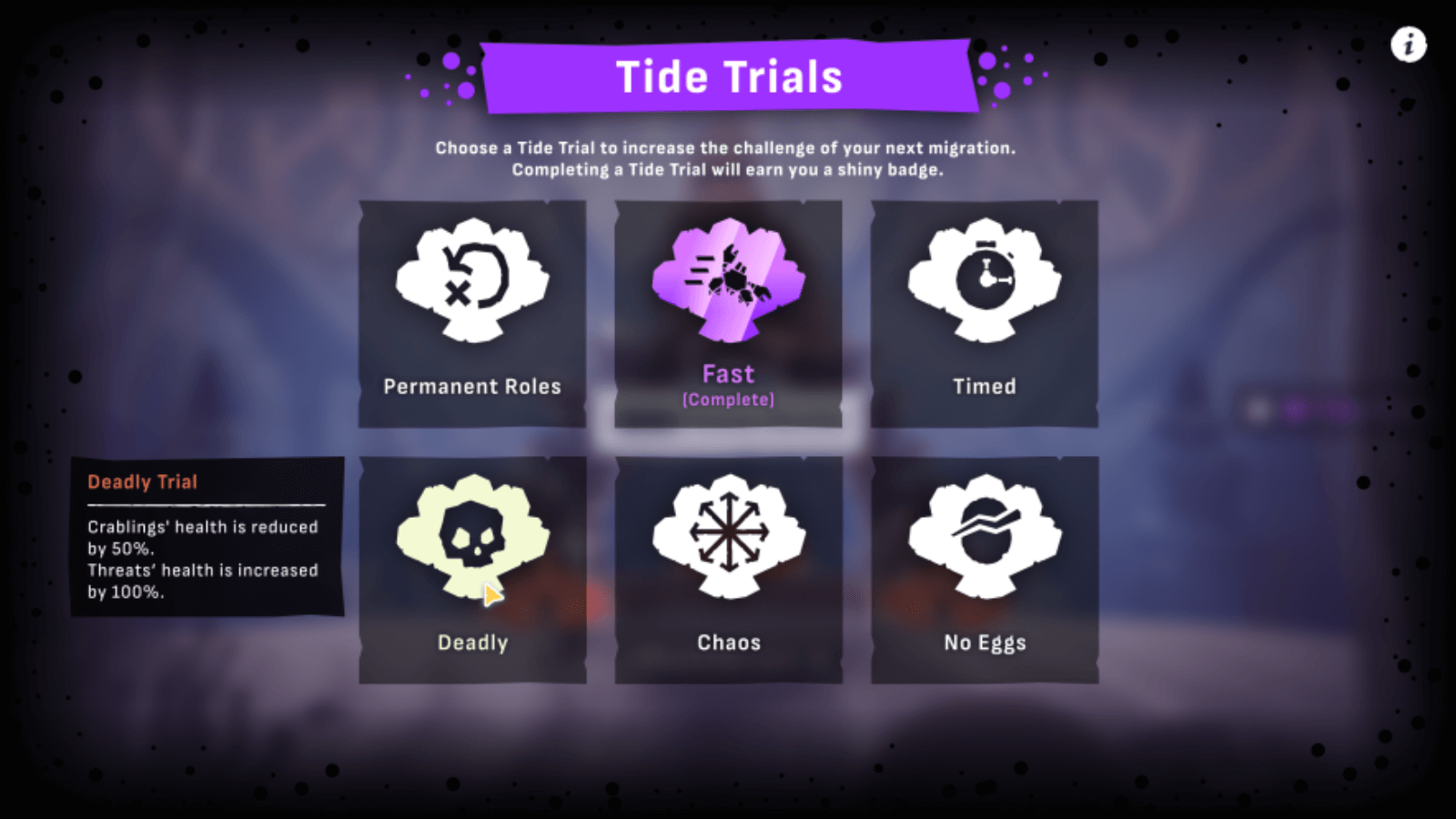 The first major update we introduced was Tide Trials, gameplay modifiers that add extra challenge or novelty to a migration. After completing your first migration, they can be activated on your next run. There are currently 6 new trials: