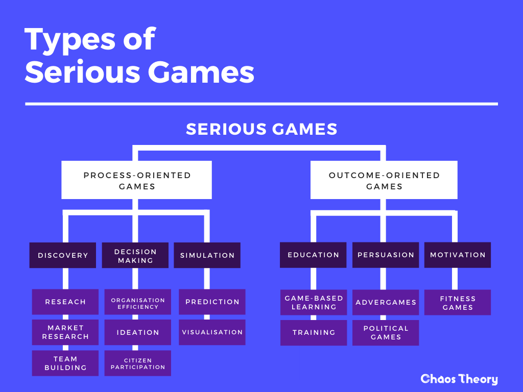 All serious games can be categorised by their function and structure, they fall into one of the following two types: outcome-based games and process-oriented games.