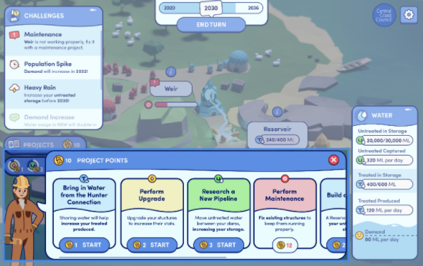 As part of the Central Coast Council's (CCC) Love Water campaign, we were tasked with developing a game to simulate the real life challenges of water management for the growing population of the Central Coast. CCC manages its own water supply for the entire region and they wanted an informative yet engaging platform to educate its community about their water management services.