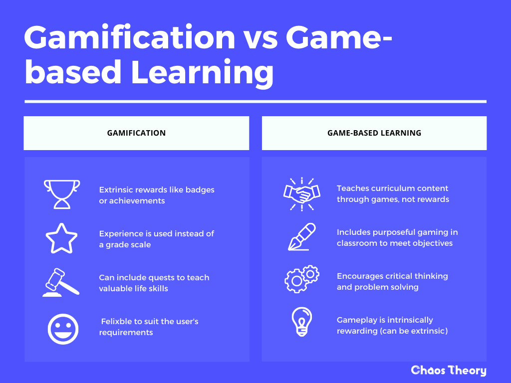 The fundamental difference between gamification and GBL is the level of integration of game mechanics with educational content. Games elements and educational objectives are balanced in game-based learning, they're fully integrated which usually qualifies GBL to assess the player and grade them on their performance. Whilst gamification is like using only parts of a game, it's implemented to motivate and reward players for completing outcomes.